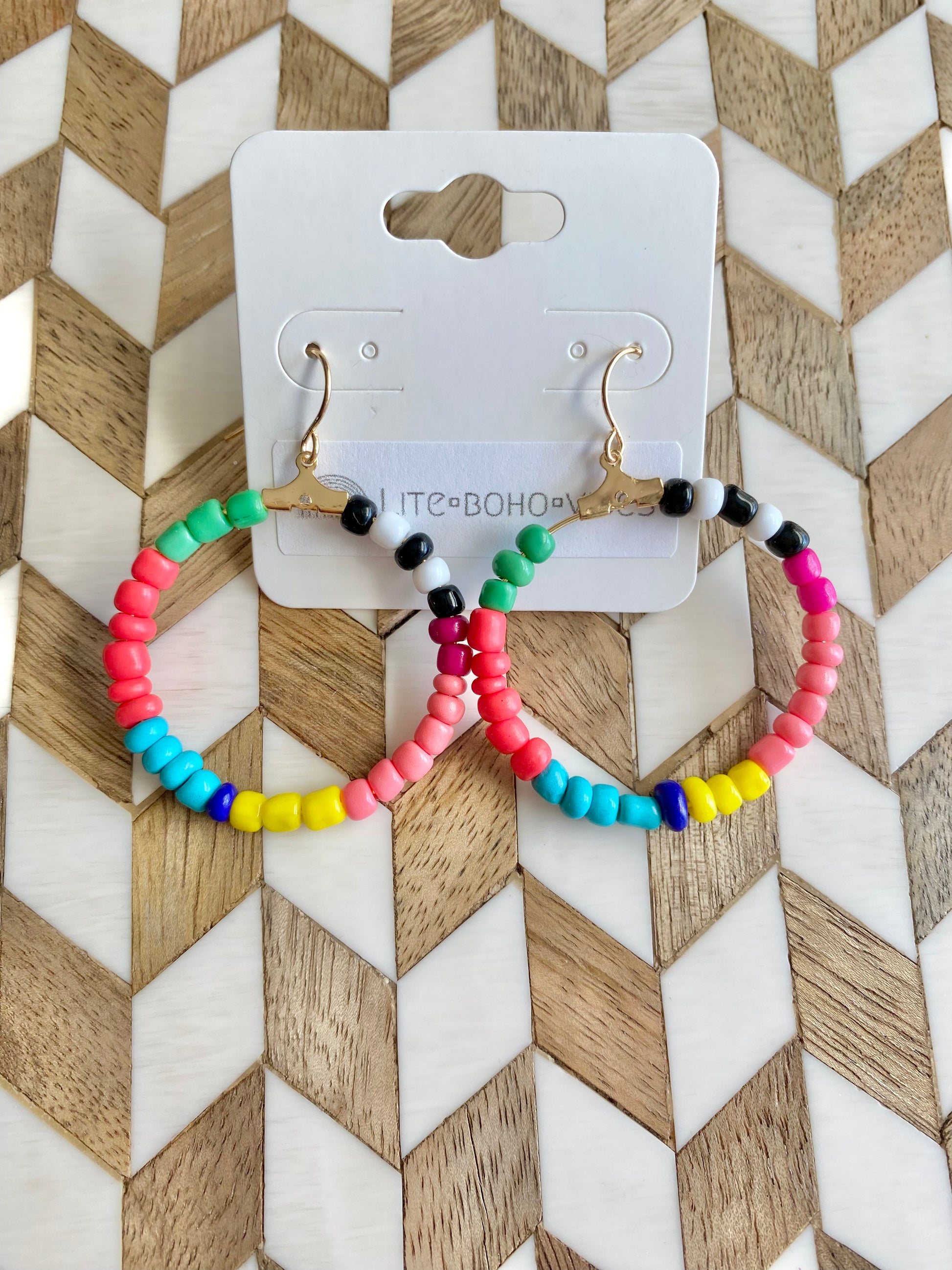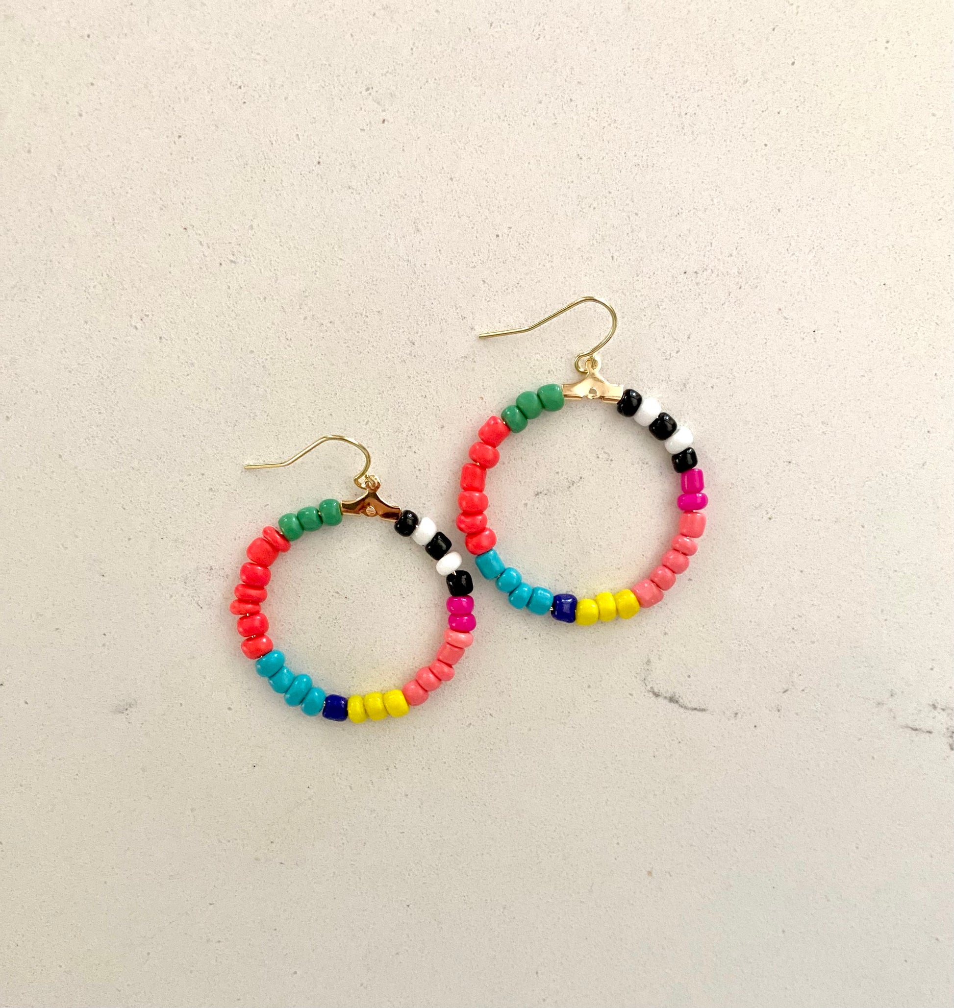 Bright (brite) colored seed beads. Earrings made with 14k plated gold.