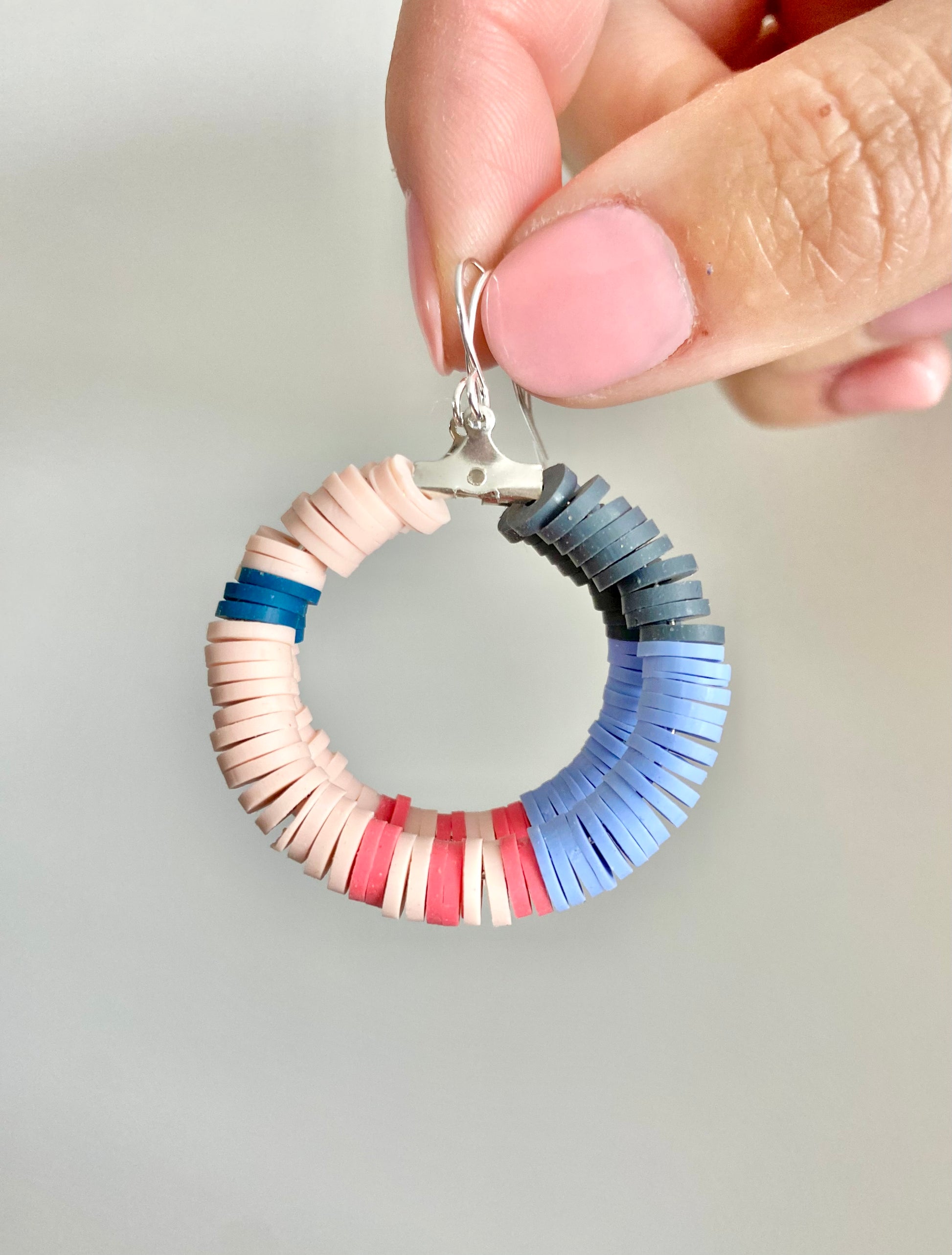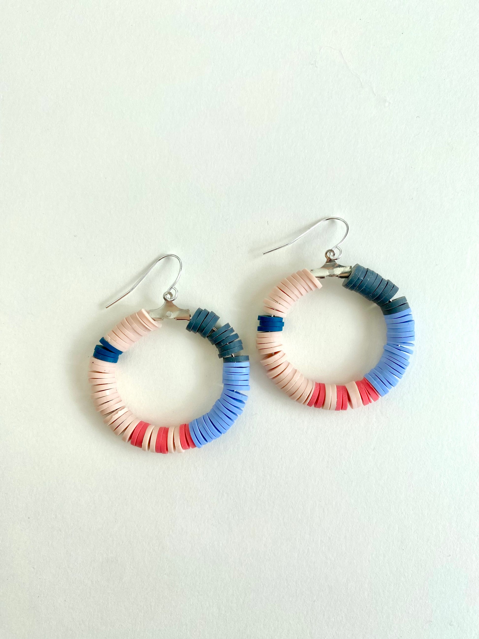 Small silver hoop earrings, gray, periwinkle, light pink / peach, coral herishi beads