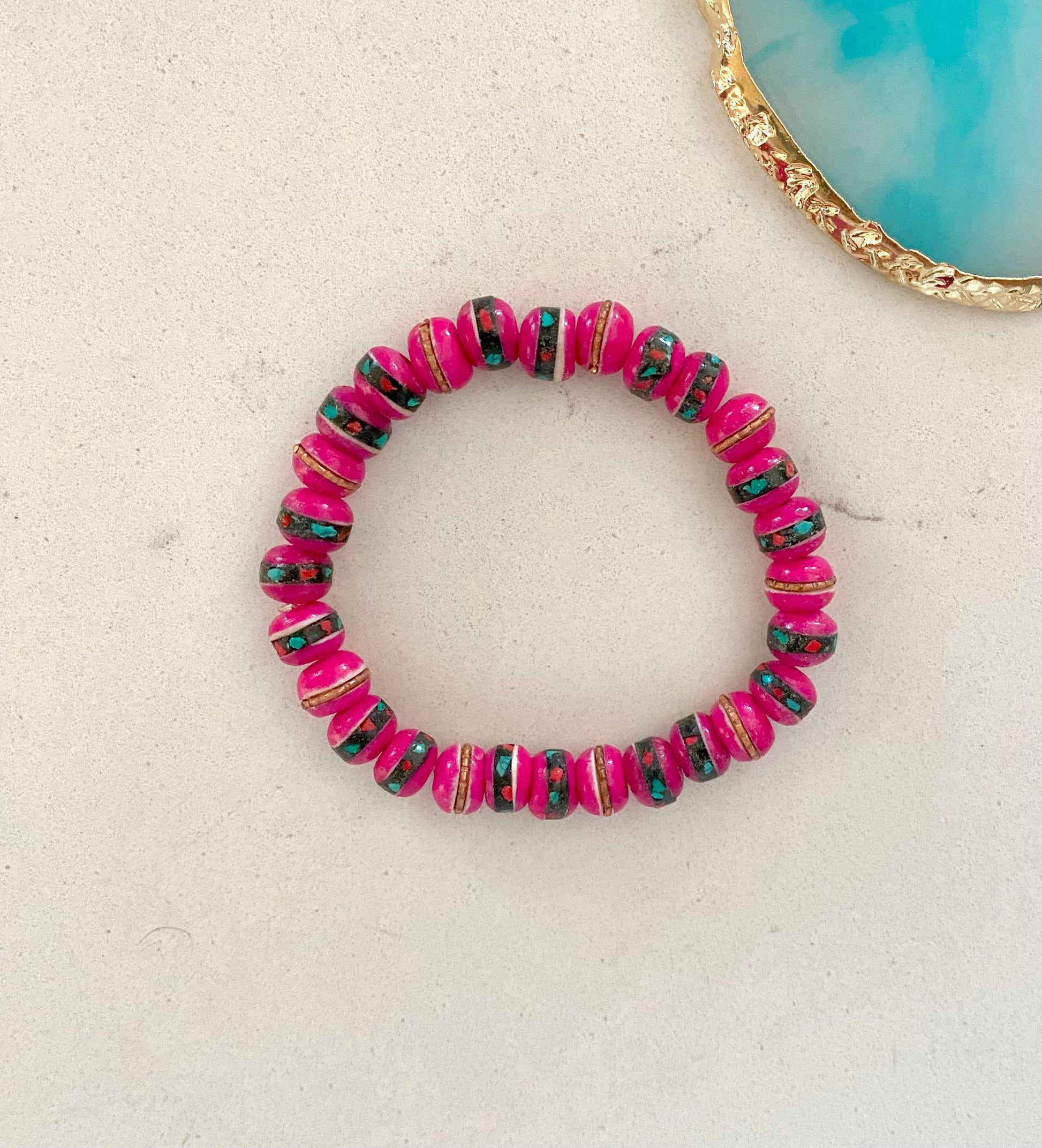 Hot pink Mala beads with turquoise and gold inlays. Mala beads can assist in meditation to gain mental clarity and live in the present.